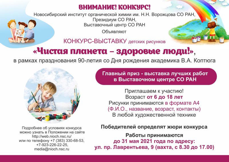 С целью привлечения внимания общественности, воспитания новых поколений в духе бережного отношения к природе в мае-июне 2021 года НИОХ СО РАН организован конкурс детского рисунка «Чистая планета – здоровые люди», посвященного задачам экологического воспитания.