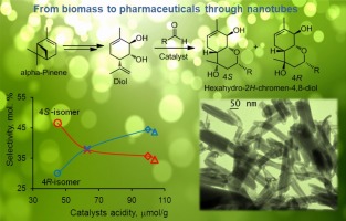 Condensation of α-pinene derived p-menta-1,8-diene-5,6-diol (diol) with decanal was studied for the first time over modified halloysite nanotubes (HNT). The yield of the desired hexahydro-2H-chromene-4,8-diol with analgesic activity was 76–80 % practically not depending on the catalyst type, while selectivity to 4S-isomer decreased, and to 4R-isomer increased with increasing acidity. The highest selectivity to 4S-diastereomer (48.1 %) on halloysite is a result of weak acidity of this catalyst. DFT optimization of the key intermediate structure shows that the nucleophile attack proceeds at the equatorial position with the 4S-diastereomer formation, which was preferred on halloysite. On strong Brønsted (Amberlyst-15) and Lewis (scandium triflate) acids the target product yield did not exceed 37 % because of dehydration. Halloysite nanocatalysts displayed a stable performance. In the case of diol reaction with a set of carbonyl compounds, the yields of hexahydro-2H-chromene-4,8-diols (up to 88.0%) and the ratio of its 4S/4R isomers (up to 21.0) were significantly higher than on other catalysts.