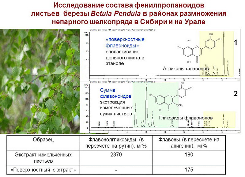 - Методом ВЭЖХ исследован качественный состав фенилпропаноидов водно-спиртового экстракта листьев березы Betula Pendula , кормового растения гусениц непарного шелкопряда, собранных в Новосибирской области и установлено, что основными являются флавоноиды и гидроксикоричные кислоты преимущественно в гликозилированном виде. Выявлено, что соотношение флавоноидов в гликозилированном и свободном виде ~10:1. Полученные данные использованы для определения степени участия фенилпропаноидов в индуцированных и конституционных защитных реакциях кормового растения против гусениц непарного шелкопряда (Совместно с ИСиЖС СО РАН).