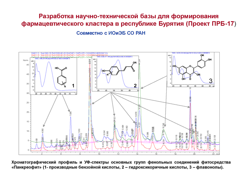 - Методом ВЭЖХ проведено исследование состава фенольных соединений экстрактов из растительного сырья Бурятии, традиционно используемого в тибетской медицине, на основе которых разработаны фитосредства «Панкреофит» и «Тиреотон». Установлено, что основными группами фенольных соединений в экстрактах являются фенолокислоты типа С6-С1 и фенилпропаноиды типа С6-С3 и С6-С3-С6. Практически во всех экстрактах идентифицирована хлорогеновая кислота и гликозилированные флавононы (Совместно с ИОиЭБ СО РАН).