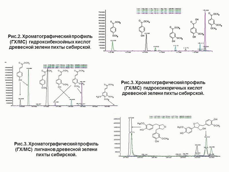 - Методами газовой и высокоэффективной жидкостной хроматографии установлен детальный состав низкомолекулярных соединений биологически активного фенольного водно-этанольного экстракта древесной зелени пихты сибирской Abies Sibirica, действующее вещество препарата для растениеводства АБИСТИМ. Методами ГХ/МС и ВЭЖХ получены детальные хроматографические профили групп гидроксибензойных и гидроксикоричных кислот, лигнанов, флавоноидов, идентифицированы все основные соединения фенольного комплекса древесной зелени пихты сибирской.