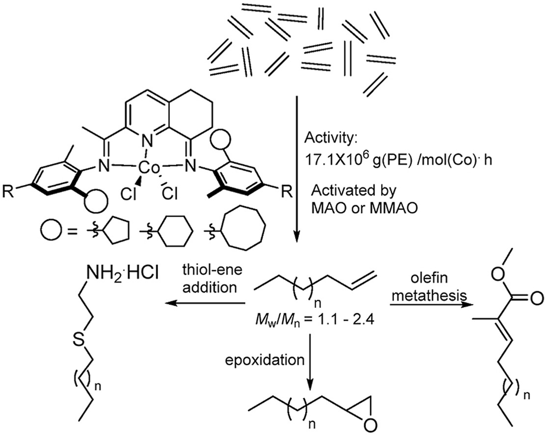 CCH3)-8-(ArN)-5,6,7-C9H8N]CoCl2 (Ar = 2-(C5H9)-6-MeC6H3 Co1, 2-(C6H11)-6-MeC6H3 Co2, 2-(C8H15)-6-MeC6H3 Co3, 2-(C5H9)-4,6-Me2C6H2 Co4, 2-(C6H11)-4,6-Me2C6H2 Co5, 2-(C8H15)-4,6-Me2C6H2 Co6), distinguishable by the ring size of the ortho-cycloalkyl substituent and type of para-R group, have been synthesized and characterized. A distorted square pyramidal geometry is a feature of the molecular structure of Co4 with the two ortho-cyclopentyl groups located on neighboring N-aryl groups trans-configured. Compounds Co1 – Co6, on activation with methylaluminoxane (MAO) or modified MAO (MMAO), proved highly productive catalysts for ethylene polymerization at 60 °C [up to 17.1 × 106 g (PE) mol−1(Co) h−1 for cyclopentyl-containing Co4/MAO]; even at 90 °C significant activity was attainable (up to 6.75 × 106 g (PE) mol−1(Co) h−1). Strictly linear polyethylene waxes of low molecular weight (ca. 1.50 kg mol−1), narrow dispersity (Mw/Mn range: 1.1–2.4) and incorporating high levels of vinyl end-groups were generated. Post-functionalization of these PE waxes by epoxidation, thiol-ene addition and cross-olefin metathesis to form e-PE, PE-S-CH2CH2NH2·HCl and PE-MMA, respectively, has been demonstrated. For comparative purposes, [2-(ArN