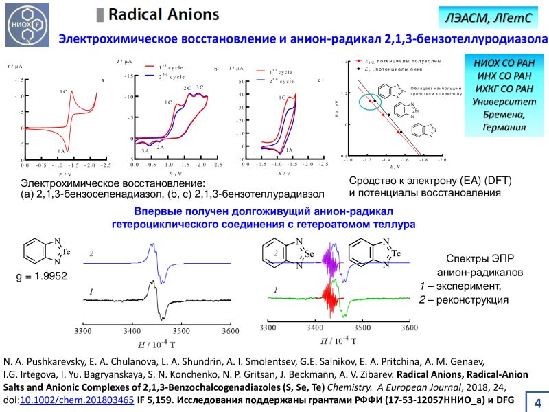 Впервые изучено электрохимическое восстановление 2,1,3-бензотеллуродиазола в тетрагидрофуране. Первая стадия восстановления представляет собой одноэлектронный квазиобратимый процесс и характеризуется наименьшим по абсолютной величине потенциалом и соответственно наибольшим сродством к электрону в ряду 2,1,3-бензохалькоген (S, Se, Te) диазолов. Восстановлением 2,1,3-бензотеллуродиазола калием на углероде (КС8) в тетрагидрофуране получен долгоживущий анион-радикал 2,1,3-бензотеллуродиазола, который охарактеризован ЭПР-спектроскопией и квантовохимическими расчетами DFT. Впервые описан долгоживущий пи-анион-радикал гетероциклического соединения с гетероатомом теллура в составе пи-электронной системы.