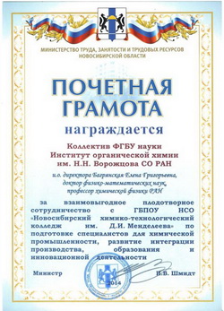 грамотой за взаимовыгодное сотрудничество с Новосибирским химико-технологическим колледжем им. Д.И. Менделеева по подготовке специалистов для химической промышленности, развитие интеграции производства, образования и инновационной деятельности